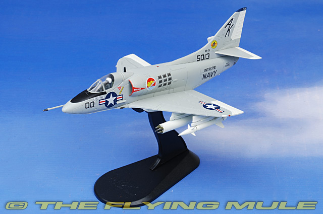 Hobby Master's 1:72 scale A-4 Skyhawk is a sturdy model constructed almost entirely from diecast metal with only the smallest amount of plastic used. This model has an opening canopy with pad-printed dials and gauges, control stick and pilot seat. Each release features a pair of 20mm cannons, a delicate refueling probe and a variety of wing-mounted weapons ordnance and fuel tanks. The series includes the early B and E variants as well as the F and M variants, which have a hump on the top of the fuselage to house upgraded avionics (also seen on retrofitted E variants).