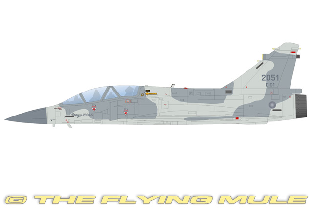 Hobby Master's 1:72 scale Mirage 2000 is a sleek diecast model with crisp panel lines, manufactured with only the smallest amount of plastic. The side mounted engine intakes with fixed inlet cones are constructed in plastic for greater accuracy and the configurable canopy provides a clear view of the instrument panel, control stick and ejection seat. The rear turbine blades are easily seen inside the exhaust nozzle and the large refueling probe is mounted on the nose (in most releases). The thin yet solid metal wing features exceptional panel line details, flap and aileron actuator arms at the rear and a complete set of removable wing mounted ordnance.