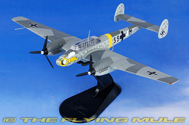 Hobby Master's 1:72 scale Messerschmitt Bf 110 is an example of a well-crafted, quality model. It has a large bird-cage canopy that is removable, revealing pad-printed dials and gauges and rear gunner's position fitted with twin defensive machine guns. The top port of the engine nacelles is seamlessly blended with the radiators under each wing. There is a removable under-wing mounted fuel tank, twin rocket tubes on each wing and counter-balance weights separately attached to each aileron. A variety of weapons configurations such as center mounted bombs, nose- and center- mounted machine guns are included. The series includes night-fighter variants with nose-mounted radar antenna.