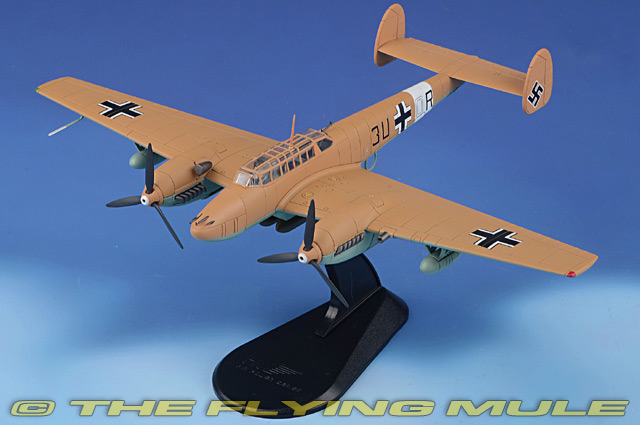 Hobby Master's 1:72 scale Messerschmitt Bf 110 is an example of a well-crafted, quality model. It has a large bird-cage canopy that is removable, revealing pad-printed dials and gauges and rear gunner's position fitted with twin defensive machine guns. The top port of the engine nacelles is seamlessly blended with the radiators under each wing. There is a removable under-wing mounted fuel tank, twin rocket tubes on each wing and counter-balance weights separately attached to each aileron. A variety of weapons configurations such as center mounted bombs, nose- and center- mounted machine guns are included. The series includes night-fighter variants with nose-mounted radar antenna.