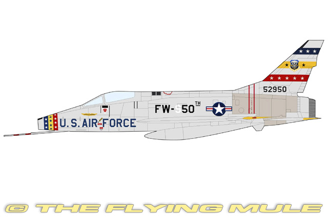 Hobby Master's 1:72 scale F-100 Super Sabre is constructed almost entirely from diecast metal, with only the smallest amount of plastic used. The fuselage is almost seamless, with a hinged articulating canopy that opens for viewing of the cockpit interior. The engine intake has near-razor sharp edges with an unusually long pitot tube, and the surface surrounding the engine is correctly unpainted. The wing has crisp panel lines, hand-painted navigation lights and a complete set of ordnance including rocket, bombs and fuel tanks. Variants include the A, C and D; the D features a larger wing, aerodynamic fences on the wings and two types of refueling probes.