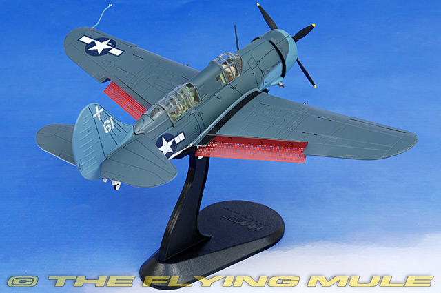Hobby Master's 1:72 scale SB2C Helldiver has many features not generally seen in this scale. The pilot's canopy slides open to reveal a pad-printed instrument panel, flight control stick and seat. The much larger rear gunner's canopy also slides open, and the aft portion can be configured in a lowered state for clearance of the twin rotating machine guns. The bomb bay doors are configurable, exposing two internal 1,000 lb bombs. When configured in the deployed position, anti-corrosion paint can be seen under each of the wing's leading edge slats. Some releases include fixed metal speed brakes photo-etched with a hole pattern like that seen on the actual aircraft.