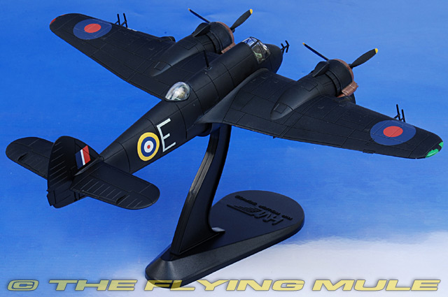 Hobby Master's 1:72 scale Bristol Beaufighter is constructed almost entirely from diecast metal with a large thick solid metal wing and stubby nose. The fuselage features four 20mm cannon ports with vents for spent shell casings, simulated fabric stretched control surfaces and removable canopies that open to reveal pad-printed instrument panels, control yoke and side-mounted equipment. The wing has six gun ports on the leading edge and seamlessly-blended engine nacelles and cooling fins on each cylinder head. Variants in the series include the TF.Mk.X torpedo fighter with removable torpedo, the night fighter Mk.IF with "herringbone" antenna and the all-weather/night attack Mk.VIF with its "thimble-nose" radome.