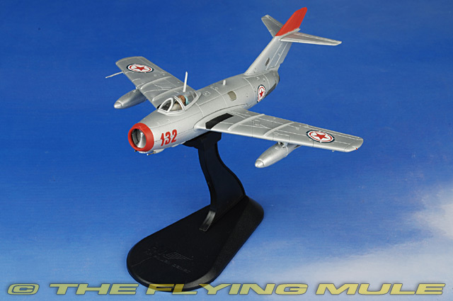 Hobby Master's 1:72 scale MiG-15 has a near-seamless construction, exceptionally crisp panel lines and just the right number of features. The canopy slides open or can be removed for an unobstructed view of the cockpit interior, highly detailed dials and gauges, control stick and side panel equipment. Three cannon pods below the nose house 23mm and 37mm cannons, each fitted with separately applied barrels. The air intake separator has transparent headlights, and most releases feature configurable speed brakes. The solid metal wing has configurable flaps that expose internal structural detail when deployed and exceptionally detailed landing gear struts and actuator arms.