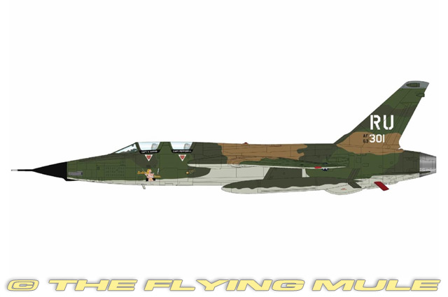 Hobby Master's 1:72 scale F-105 Thunderchief is a large, heavy model in this scale. This model has many fine features, including an accurately rendered "wasp waist" fuselage, a hinged canopy that locks securely in place leaving almost no visible gap, and cockpit details that include pad-printed screens and dial instrument panel. There is a M61 Vulcan cannon port, moveable horizontal stabilators that rotate in unison and an exhaust nozzle that can be configured. The solid metal wing has a plastic engine intake, which allows for correct replication of sharp edges. Most releases include a full range of ordnance (exceptions include air show releases).