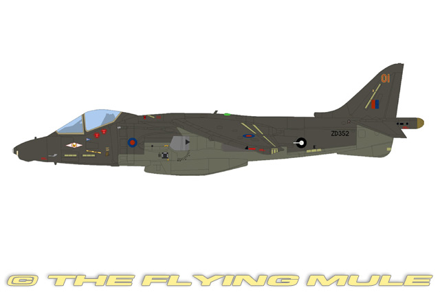 Hobby Master's 1:72 scale Harrier is a very well-executed model designed with great attention to detail and constructed almost entirely from diecast metal, with only a small amount of plastic. The configurable canopy provides an unobstructed view of the unusually detailed instrument panel. The turbofan can be clearly seen inside the engine intake, the elevators rotate in unison, and there are four independently positionable engine exhaust ports with small vectoring ports at the rear and on the wingtips. The series includes the US AV-8B variant and the UK GR.Mk 9, and each release features a variety of removable fuel tanks and ordnance.