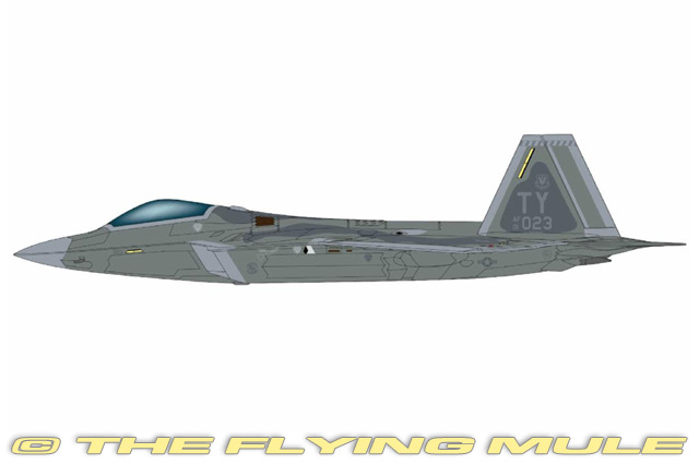 Hobby Master's 1:72 scale F-22 Raptor is constructed almost entirely in diecast metal with near-seamless construction. The cockpit has an articulating hinged smoke-colored canopy that closes with almost no visible gap and opens to reveal a detailed interior with side-mounted fly-by-wire joystick, throttle controls, ejection seat and pad-printed digital display screens. The stabilators are movable, and the under-wing mounted fuel tanks are removable. The landing gear are constructed as complete subassemblies for quick configuration, and a full complement of configurable ordnance exposes structural details when configured in the deployed position.