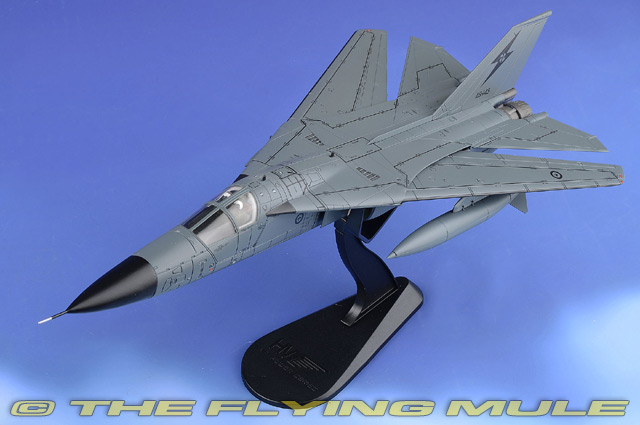 Hobby Master's 1:72 scale F-111 Aardvark is a large model in this scale with many fine features, such as articulating swing wings with under-wing ordnance, configured with ball and socket mounts for secure and easy positioning. The large canopy is removable for easy viewing of the cockpit's interior and crew figures, and structural component details can be seen inside the main gear bay. The landing gear has been included as complete subassemblies for quick and easy configuration. Variants in this series include the early F-111A, the F-111C with longer wings and the EF-111A Raven with electronic warfare equipment bulge on top of the fin.