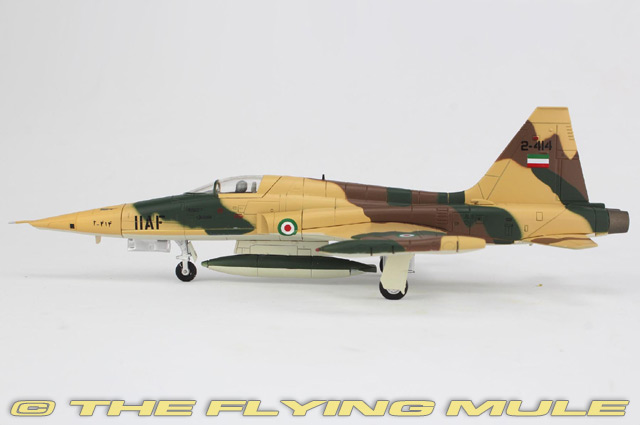 Hobby Master's 1:72 scale F-5 Tiger II is a sleek and fast looking model that uses a clever mix of metal and plastic components with near-seamless construction. The solid metal wing has sharp-edged plastic leading edge root extensions appropriate to the variant being modeled. The removable canopy provides a clear view of the cockpit's interior features such as the pad-printed front and side mounted instrument panels. Landing gear and doors have been included as one piece sub-assemblies that allow for quick and easy configuration for ground display. The series covers both fighter variants with optional ordnance configurations (see photos) and the long nose reconnaissance variant.