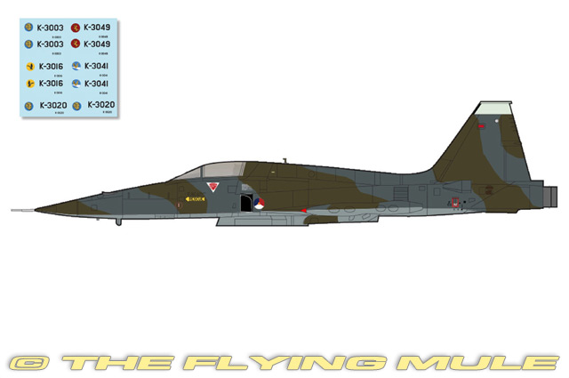 Hobby Master's 1:72 scale F-5 Tiger II is a sleek and fast looking model that uses a clever mix of metal and plastic components with near-seamless construction. The solid metal wing has sharp-edged plastic leading edge root extensions appropriate to the variant being modeled. The removable canopy provides a clear view of the cockpit's interior features such as the pad-printed front and side mounted instrument panels. Landing gear and doors have been included as one piece sub-assemblies that allow for quick and easy configuration for ground display. The series covers both fighter variants with optional ordnance configurations (see photos) and the long nose reconnaissance variant.