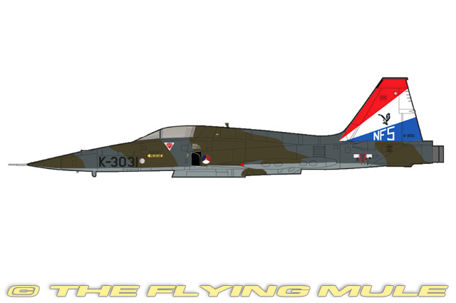 Hobby Master's 1:72 scale F-5 Tiger II is a sleek and fast looking model that uses a clever mix of metal and plastic components with near-seamless construction. The solid metal wing has sharp-edged plastic leading edge root extensions appropriate to the variant being modeled. The removable canopy provides a clear view of the cockpit's interior features such as the pad-printed front and side mounted instrument panels. Landing gear and doors have been included as one piece sub-assemblies that allow for quick and easy configuration for ground display. The series covers both fighter variants with optional ordnance configurations (see photos) and the long nose reconnaissance variant.