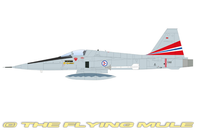 Hobby Master's 1:72 scale F-5 Tiger II is a sleek and fast looking model that uses a clever mix of metal and plastic components with near-seamless construction. The solid metal wing has sharp-edged plastic leading edge root extensions appropriate to the variant being modeled. The removable canopy provides a clear view of the cockpit's interior features such as the pad-printed front and side mounted instrument panels. Landing gear and doors have been included as one piece sub-assemblies that allow for quick and easy configuration for ground display. The series covers both fighter variants with optional ordnance configurations (see photos) and the long nose reconnaissance variant.