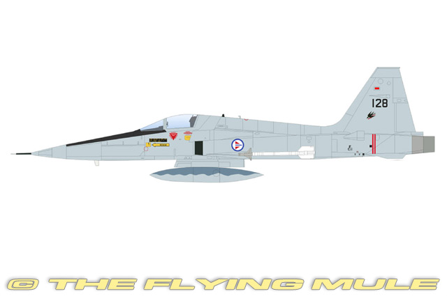 Hobby Master's 1:72 scale F-5 Tiger II is a sleek and fast looking model that uses a clever mix of metal and plastic components with near-seamless construction. The solid metal wing has sharp-edged plastic leading edge root extensions appropriate to the variant being modeled. The removable canopy provides a clear view of the cockpit's interior features such as the pad-printed front and side mounted instrument panels. Landing gear and doors have been included as one piece sub-assemblies that allow for quick and easy configuration for ground display. The series covers both fighter variants with optional ordnance configurations (see photos) and the long nose reconnaissance variant.