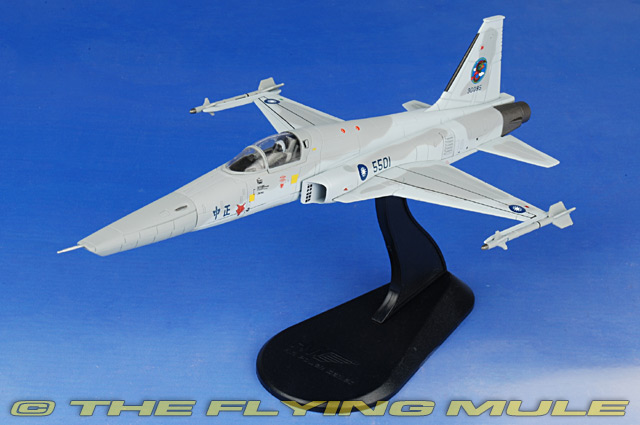 Hobby Master's 1:72 scale F-5 Tiger II is a sleek and fast looking model that uses a clever mix of metal and plastic components with near-seamless construction. The solid metal wing has sharp-edged plastic leading edge root extensions appropriate to the variant being modeled. The removable canopy provides a clear view of the cockpit's interior features such as the pad-printed front and side mounted instrument panels. Landing gear and doors have been included as one piece sub-assemblies that allow for quick and easy configuration for ground display. The series covers both fighter variants with optional ordnance configurations (see photos) and the long nose reconnaissance variant.