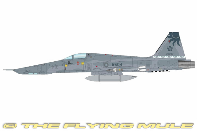 Hobby Master's 1:72 scale F-5 Tiger II is a sleek and fast looking model that uses a clever mix of metal and plastic components with near-seamless construction. The solid metal wing has sharp-edged plastic leading edge root extensions appropriate to the variant being modeled. The removable canopy provides a clear view of the cockpit's interior features such as the pad-printed front and side mounted instrument panels. Landing gear and doors have been included as one piece sub-assemblies that allow for quick and easy configuration for ground display. The series covers both fighter variants with optional ordnance configurations (see photos) and the long nose reconnaissance variant.