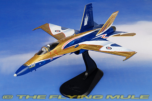 In 2009 to mark the 100th anniversary of powered flight in Canada CF-18 188719 from the 4 Wing, Cold Lake, Alberta was given a special paint scheme. Unlike previous special schemes that only had the tails painted 719 received a complete make over and is referred to as the “Centennial Hornet”. The design incorporates many of the graphic features found on earlier Canadian Forces aircraft as well as markings representative of Canada. The blue and gold represents 85 years of the Canadian Air Force and 100 years of powered flight in Canada. The gold also represents the colors of the former Centennaires and Golden Hawks, the red and white striping is a stylized representation of the lightning bolts of the CF-101 Voodoo. On the vertical stabilizers just above the inscription 100 1909 - 2009 is a depiction of the “Silver Dart” that made the first powered flight in Canada in 1909. Also on the vertical stabilizers are colorful depictions of the Northern Lights with the single North Star at the top. On the actual aircraft just below the red and white markings as well as several other locations there are 100 printed names of people considered to have made noteworthy contributions to Canadian aviation. On the left engine cowling are the names of the people that paint crew, on the outside of the landing gear door are other names of people associated with this project as well as the CF-18 Demo Team logo. There are some signatures and company logos on the inside of the landing gear doors and other little markings for you to discover.