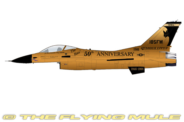 In 1996, the Iowa Air National Guard's 185th Fighter Wing at Sioux City celebrated its 50th anniversary with a distinctive "Golden Bat" F-16C Viper heritage scheme. The aircraft, painted in gloss black with striking gold trim and a bat insignia on the tail, honored the unit's World War II identity as the "Batmen." At the time, the wing had recently transitioned from the A-7D Corsair II to the F-16C, marking a leap in capability with advanced avionics, radar, and supersonic performance. The Golden Bat jet quickly became a crowd favorite at airshows, symbolizing the 185th's proud history, modern combat readiness, and Iowa ANG heritage.