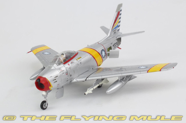 In the 1950s, the Republic of China Air Force (ROCAF) operated the North American F-86F Sabre as its premier jet fighter, acquired through U.S. military assistance amid rising tensions with the People's Republic of China. Stationed primarily in Taiwan, ROCAF Sabres played a vital role in defending the Taiwan Strait and intercepting Chinese MiG-15s and MiG-17s. The F-86F's agility, speed, and six .50 caliber machine guns made it a formidable adversary in dogfights. ROCAF pilots achieved several air-to-air victories during the 1958 Taiwan Strait Crisis, establishing the Sabre as a cornerstone of Taiwan's early Cold War air defense strategy. Designed to meet a USAAF requirement for a day-fighter/escort fighter/dive-bomber, the F-86 was first flown on October 1st, 1947. The Sabre's swept-wing "flying tail" configuration and a hydraulic flight-control system were some of its many firsts in technology and design that have now become standard for jet-powered aircraft. Armed with six 50 caliber machine guns, the F-86 saw extensive action in the Korean War, where it was often pitted against the MiG-15. The Sabre pilot had to be in visual contact and within gun range of the enemy in order to attempt a shoot-down, thereby making this aircraft the last true "dogfighter" in Air Force inventory. © Copyright 2003-2025 The Flying Mule, Inc. The Hobby Master "1:72 Air Power Series" range presents detailed, ready-made diecast models of military aircraft. Hobby Master "1:72 Air Power Series" diecast airplanes feature: - Diecast metal construction with some plastic components.