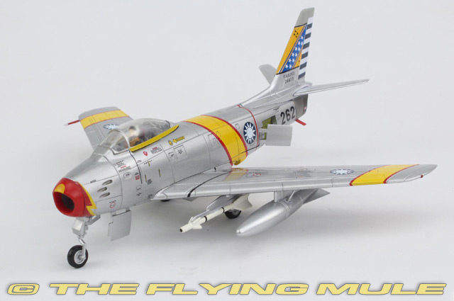 In the 1950s, the Republic of China Air Force (ROCAF) operated the North American F-86F Sabre as its premier jet fighter, acquired through U.S. military assistance amid rising tensions with the People's Republic of China. Stationed primarily in Taiwan, ROCAF Sabres played a vital role in defending the Taiwan Strait and intercepting Chinese MiG-15s and MiG-17s. The F-86F's agility, speed, and six .50 caliber machine guns made it a formidable adversary in dogfights. ROCAF pilots achieved several air-to-air victories during the 1958 Taiwan Strait Crisis, establishing the Sabre as a cornerstone of Taiwan's early Cold War air defense strategy. Designed to meet a USAAF requirement for a day-fighter/escort fighter/dive-bomber, the F-86 was first flown on October 1st, 1947. The Sabre's swept-wing "flying tail" configuration and a hydraulic flight-control system were some of its many firsts in technology and design that have now become standard for jet-powered aircraft. Armed with six 50 caliber machine guns, the F-86 saw extensive action in the Korean War, where it was often pitted against the MiG-15. The Sabre pilot had to be in visual contact and within gun range of the enemy in order to attempt a shoot-down, thereby making this aircraft the last true "dogfighter" in Air Force inventory. © Copyright 2003-2025 The Flying Mule, Inc. The Hobby Master "1:72 Air Power Series" range presents detailed, ready-made diecast models of military aircraft. Hobby Master "1:72 Air Power Series" diecast airplanes feature: - Diecast metal construction with some plastic components.
