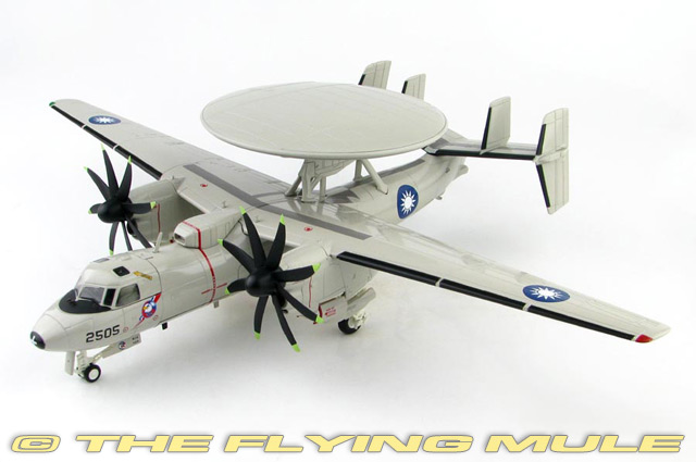 In May 1993 Taiwan signed a contract for two E-2T Hawkeye (T for Taiwan) that were the equivalent of the E-2C. In 1999 the RoCAF approved the acquisition of two more E-2T. Some parts from four retired E-2Bs were used that wouldn't affect their E-2C standards. The first two aircraft were received in October 2004 with 2505 and 2506 arriving on May 19, 2005. On May 26 both aircraft flew to their home base at Pingtung's 439 Wing. January 1, 2000 the E-2Ts were reassigned to the Pingtung 2nd AEW Squadron 20th Group. Designed as a replacement for the E-1 Tracer, the Grumman E-2 Hawkeye was first flown in 1960. This all-weather tactical Airborne Early Warning aircraft is the only aircraft-carrier capable aircraft to carry a large rotating dome, which houses the antennas for its long-range radars. Used primarily by the US Navy, the E-2 provides surveillance and airborne early warning of anti-ship and enemy aircraft attacks. Sometimes called "The Hummer" because of its distinctive engine sounds, the E-2 is one of only two propeller airplanes that currently operate from aircraft carriers. The E-2 is still undergoing upgrades, with the modern E-2D taking its first flight in August 2007. © Copyright 2003-2025 The Flying Mule, Inc. The Hobby Master "1:72 Air Power Series" range presents detailed, ready-made diecast models of military aircraft. Hobby Master "1:72 Air Power Series" diecast airplanes feature: - Diecast metal construction with some plastic components.