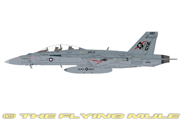 VFA-41 Black Aces operates the F/A-18F Super Hornet as part of US Navy carrier air wings. Based at NAS Lemoore, the squadron flies the two seat Super Hornet in air to air combat, precision strike, and close air support roles. The F/A-18F features advanced radar, targeting systems, and the ability to carry a wide range of guided weapons. VFA-41 has deployed aboard carriers such as USS Nimitz and USS Abraham Lincoln, supporting operations in the Middle East and Indo Pacific. The squadron maintains high readiness, demonstrating the Super Hornet's versatility in modern naval aviation operations. Designed as a replacement for the A-4 Skyhawk and the A-7 Corsair II and as a complement to the F-14 Tomcat, the F/A-18 first flew on November 18, 1978. Perhaps best known as the aircraft of the US Navy's Blue Angels, this carrier-capable, supersonic, all-weather fighter has many roles, including fighter escort, fleet air defense and close air support. The F/A-18 is a versatile aircraft: it can operate from carriers or land bases and a single switch converts it from fighter to strike mode. During Operation Desert Storm, the F/A-18 proved that, on a single mission, one aircraft could serve as both fighter and a bomber. © Copyright 2003-2026 The Flying Mule, Inc. The Hobby Master "1:72 Air Power Series" range presents detailed, ready-made diecast models of military aircraft. Hobby Master "1:72 Air Power Series" diecast airplanes feature: - Diecast metal construction with some plastic components.