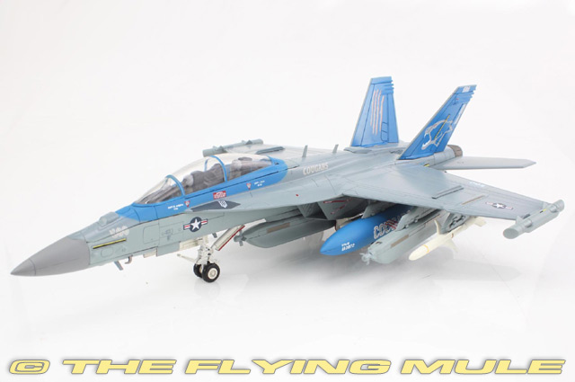 VAQ-139 "Cougars" operates the EA-18G Growler from Naval Air Station Whidbey Island, Washington. Assigned to Carrier Air Wing Seventeen (CVW-17), they deploy aboard the USS Nimitz (CVN-68), focusing on electronic warfare missions. The EA-18G's advanced jamming systems disrupt enemy radar and communications, ensuring air superiority and protection for strike packages in contested environments. VAQ-139 regularly participates in exercises and real-world operations, including deployments in the Indo-Pacific region. Under skilled leadership, the squadron maintains high readiness and proficiency, playing a crucial role in U.S. Navy efforts to dominate electromagnetic battlespaces and support carrier strike group missions worldwide. Designed as a replacement for the A-4 Skyhawk and the A-7 Corsair II and as a complement to the F-14 Tomcat, the F/A-18 first flew on November 18, 1978. Perhaps best known as the aircraft of the US Navy's Blue Angels, this carrier-capable, supersonic, all-weather fighter has many roles, including fighter escort, fleet air defense and close air support. The F/A-18 is a versatile aircraft: it can operate from carriers or land bases and a single switch converts it from fighter to strike mode. During Operation Desert Storm, the F/A-18 proved that, on a single mission, one aircraft could serve as both fighter and a bomber. © Copyright 2003-2025 The Flying Mule, Inc. The Hobby Master "1:72 Air Power Series" range presents detailed, ready-made diecast models of military aircraft. Hobby Master "1:72 Air Power Series" diecast airplanes feature: - Diecast metal construction with some plastic components.