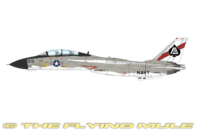 US Navy Fighter Squadron 41 (VF-41) Black Aces was commissioned on June 1st, 1945 flying the F4U Corsair. The squadron transitioned through the F2H Banshee, F3H Demon and F-4 Phantom II before upgrading to the F-14 Tomcat in 1976. The Black Aces deployed several times on the USS Nimitz, often sharing the deck with F-14s from VF-84 Jolly Rogers. It was during one of these cruises, on August 19th, 1981, that Black Aces Tomcats shot-down two Libyan Su-22 Fitters over the Gulf of Sidra. This was the first ever combat incident involving US Tomcats. The squadron's final cruise with the F-14 took place in 2001 aboard the USS Enterprise. Upon return, VF-41 transitioned to the F/A-18F Super Hornet. Designed to carry the formidable long range AIM-54 Phoenix missile, the Grumman F-14 Tomcat was first flown on December 21st, 1970. Made famous by the Hollywood film Top Gun, the F-14 replaced the F-4 Phantom II as the US Navy's primary maritime air superiority fighter. Its design includes a variable geometry wing that can sweep back for high speed supersonic intercepts and forward for improved positioning in air to air dogfights. Nicknamed "Bombcat," the F-14 spent much of its late career in an air-to-ground role, carrying the Low Altitude Navigation and Targeting Infrared for Night (LANTIRN) system. © Copyright 2003-2026 The Flying Mule, Inc. The Hobby Master "1:72 Air Power Series" range presents detailed, ready-made diecast models of military aircraft. Hobby Master "1:72 Air Power Series" diecast airplanes feature: - Diecast metal construction with some plastic components.
