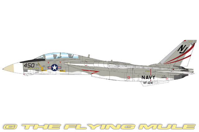 In 1978, VF-124 "Gunfighters", the U.S. Navy's F-14 Tomcat Fleet Replacement Squadron at NAS Miramar, California, trained pilots and Radar Intercept Officers (RIOs) on the new F-14A Tomcat. The squadron focused on mastering air-to-air intercepts, AIM-54 Phoenix missile operations, and fleet integration procedures. October 1978 marked part of the early operational phase for the Tomcat, as VF-124 prepared crews for deployment aboard USS Enterprise and other Pacific Fleet carriers. Training included high-speed maneuvering, radar tracking, and coordination with other fighter and support aircraft to ensure readiness for Cold War missions. Designed to carry the formidable long range AIM-54 Phoenix missile, the Grumman F-14 Tomcat was first flown on December 21st, 1970. Made famous by the Hollywood film Top Gun, the F-14 replaced the F-4 Phantom II as the US Navy's primary maritime air superiority fighter. Its design includes a variable geometry wing that can sweep back for high speed supersonic intercepts and forward for improved positioning in air to air dogfights. Nicknamed "Bombcat," the F-14 spent much of its late career in an air-to-ground role, carrying the Low Altitude Navigation and Targeting Infrared for Night (LANTIRN) system. © Copyright 2003-2025 The Flying Mule, Inc. The Hobby Master "1:72 Air Power Series" range presents detailed, ready-made diecast models of military aircraft. Hobby Master "1:72 Air Power Series" diecast airplanes feature: - Diecast metal construction with some plastic components.