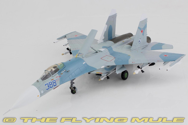 At the 1989 Paris Air Show, the Soviet Su-27 "Flanker" stunned Western audiences with its dramatic aerobatic display, particularly aircraft #388 flown by test pilot Viktor Pugachev. Performing the now-famous "Pugachev's Cobra" maneuver, the Su-27 showcased its exceptional agility, thrust-to-weight ratio, and advanced flight control system. The demonstration highlighted the Flanker's formidable capabilities, including its powerful engines and aerodynamic design, which gave it an edge in close-in dogfights. This marked one of the first times a frontline Soviet fighter was publicly demonstrated in the West, making #388 a symbol of Soviet aerospace prowess at the close of the Cold War. Designed by the Soviet Union to challenge the superiority of fourth generation US fighters such as the F-15 Eagle, the Su-27 was first flown on May 20, 1977. This one seat Mach-2 fighter had the Soviet Union's first operational fly-by-wire system. The aircraft is very large compared to the MiG-29, its closest Soviet counterpart, but it is built with a high percentage of titanium, which helps minimize its weight. It is exceptionally agile and is perhaps most famous for its "Cobra" maneuver, which is a short, sustained level flight at a 120 degree angle of attack, often performed at air shows. © Copyright 2003-2025 The Flying Mule, Inc. The Hobby Master "1:72 Air Power Series" range presents detailed, ready-made diecast models of military aircraft. Hobby Master "1:72 Air Power Series" diecast airplanes feature: - Diecast metal construction with some plastic components.