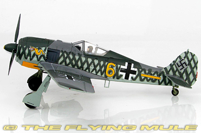 Hobby Master's 1:48 scale Fw 190 is a quality model, assembled with exceptional craftsmanship and attention to detail. Among this model's features are a solid metal wing with simulated fabric-stretched control surfaces, a 12-bladed cooling fan that spins in unison with the propeller, cylinder head cooling fins that are visible inside the cowling, individual exhaust stacks, removable center mounted fuel tank and a sliding canopy that reveals pad printed dials and gauges inside the cockpit. Variants in this series include the early 190A, the upgraded 190A with armor plating, and the 190F attack variant with larger canopy and removable center-mounted bombs.