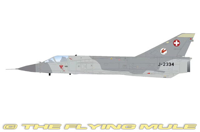 The Swiss Air Force operated the Mirage IIIS as a supersonic interceptor from the mid 1960s until its retirement in 1999. Based on the French Mirage III, the IIIS was modified for Swiss requirements with strengthened structure, improved radar, and the ability to operate from hardened mountain bases. Its primary mission was air defense, intercepting intruding aircraft over Swiss airspace during the Cold War. The Mirage IIIS was armed with air to air missiles and cannon, providing rapid reaction capability. It formed the backbone of Swiss air defense for decades before being replaced by the F/A-18 Hornet. Designed to meet a French government specification for a lightweight, all-weather interceptor, the Dassault Mirage III was first flown on November 17, 1956. This supersonic aircraft has a tailless delta wing configuration and is capable of high speeds (a Mirage IIIA was the first European aircraft to exceed Mach 2 in level flight). It has a provision for a SEPR liquid-fuel rocket engine, which provides additional burst thrust. In production for over a decade, the Mirage III is considered one of Europe's most successful military aircraft designs, serving 20 different nations, some of whom still fly it today. © Copyright 2003-2026 The Flying Mule, Inc. The Hobby Master "1:72 Air Power Series" range presents detailed, ready-made diecast models of military aircraft. Hobby Master "1:72 Air Power Series" diecast airplanes feature: - Diecast metal construction with some plastic components.