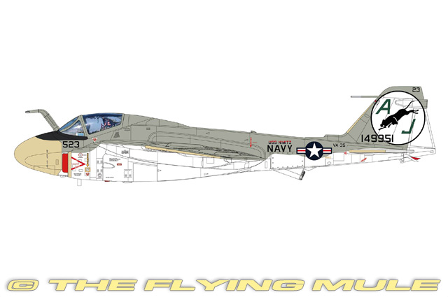 In 1975, VA-35 Black Panthers operated the KA-6D Intruder from USS Nimitz during the carrier's early operational period. The KA-6D was a tanker variant of the A-6, used for aerial refueling of carrier air wing aircraft. VA-35 crews flew missions to extend the range and endurance of fighters and attack aircraft during training and deployment operations. Based aboard USS Nimitz, the squadron supported flight operations with reliable refueling capability in all weather conditions. The KA-6D played a critical role in carrier aviation, allowing sustained air operations and enhancing the flexibility of naval air power. Designed to meet a US Navy requirement for an all-weather carrier-based attack/strike aircraft, the A-6 Intruder was first flown on April 19th, 1960. The A-6 was equipped with a CRT that allowed for low-level flight in all weather conditions, a characteristic that helped it remain the US Navy and US Marine Corps' principle night and all-weather attack aircraft through the 1990s. With its large, blunt nose and lean tail, the A-6 was given a variety of unflattering nicknames, including "Double Ugly" and the "Drumstick." The A-6 served in Vietnam, the Persian Gulf, Somalia and Bosnia and was ultimately replaced by the F-14 Tomcat. © Copyright 2003-2026 The Flying Mule, Inc. The Hobby Master "1:72 Air Power Series" range presents detailed, ready-made diecast models of military aircraft. Hobby Master "1:72 Air Power Series" diecast airplanes feature: - Diecast metal construction with some plastic components.