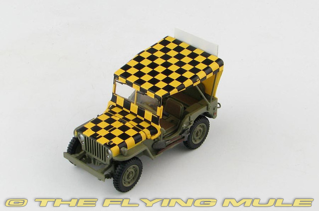 Hobby Master's 1:48 scale Jeep packs a lot of scale detail into a small package. The chassis and drive train is constructed almost entirely in diecast metal providing a nice weighted feel to the model. The interior features a pad-printed instrument panel, separately painted seat cushions and scale steering wheel and transmission gear-shifts levers. Each release highlights a variety of cabin equipment configurations such as a center mounted machine gun, open or closed ragtop and rear mounted radio equipment (See Photos). Separately applied battlefield equipment includes shovels, hatchets, jerry cans and a spare tire. Underneath the model the drive train and leaf-spring suspension are clearly visible.