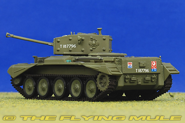 Hobby Master's 1:72 scale Cruiser tank is constructed with a blend of diecast metal and plastic, with plastic used to achieve maximum detail and a discreet internal weight added for a heavy feel. The 360 degree rotating plastic turret features simulated armor plates with large bosses and a pivoting metal cannon. The lower portion of the hull is constructed in diecast metal with the top in plastic, which allows for fine details such as panel hinges, equipment and tools and delicate shield guards over the front headlights. Variants in the series include the early Centaur models and later Cromwells with a variety of main cannon.