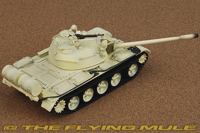 Hobby Master's 1:72 scale T-55 is constructed with an intelligent mix of diecast metal and plastic, which gives this model maximum scale replication. One of the highlights of this T-55 is an extraordinarily detailed turret, which is constructed of diecast metal combined with plastic components such as the separately-applied commander and gunner's hatches with scale rivets and hinges, the floodlights and the DShk 108mm heavy machine gun. The mantlet has a simulated canvas cover and the cannon is made of solid diecast metal. The hull is constructed of plastic, with separately-applied equipment storage boxes, tow cables and spare track. The lever arms of the torsion bar suspension can be seen on the model's underside.
