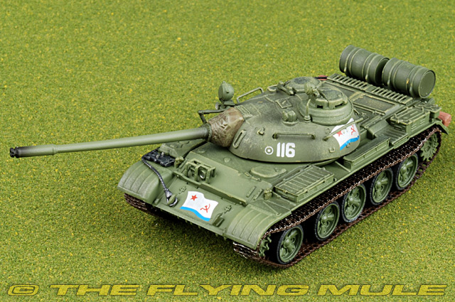 Hobby Master's 1:72 scale T-55 is constructed with an intelligent mix of diecast metal and plastic, which gives this model maximum scale replication. One of the highlights of this T-55 is an extraordinarily detailed turret, which is constructed of diecast metal combined with plastic components such as the separately-applied commander and gunner's hatches with scale rivets and hinges, the floodlights and the DShk 108mm heavy machine gun. The mantlet has a simulated canvas cover and the cannon is made of solid diecast metal. The hull is constructed of plastic, with separately-applied equipment storage boxes, tow cables and spare track. The lever arms of the torsion bar suspension can be seen on the model's underside.