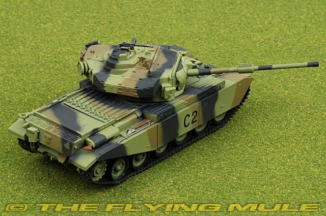 Hobby Master's 1:72 scale Centurion tank is constructed with a blend of diecast metal and plastic, with plastic used to achieve maximum detail and a discreet internal weight added for a heavy feel. The 360 degree rotating turret is made from finely detailed plastic and has a pivoting metal cannon. Side-mounted equipment storage boxes, spare track, smoke grenade launchers and machine gun are separately attached. The lower portion of the hull is constructed in metal, and the plastic top portion features a detailed front driver's hatch and side-mounted tools. The unique externally-mounted Horstmann suspension is clearly seen inside the tracks and on the bottom of the model.