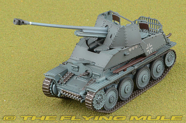 Hobby Master's 1:72 scale Marder III is constructed with an intelligent mix of diecast metal and plastic components, with the lower portion of the hull made from diecast metal and the upper portion in plastic. Fine details can be seen on the cannon breach system, operator seats and scale rivets on the top of the armor plating. The rotating turret has a pivoting metal cannon and can slide back and forward on its cradle. The open top turret design allows for easy viewing of the gun sight, dial controls and ammo storage details. Battlefield equipment includes side mounted hatchets, lever bar and jack and separately applied spare track.