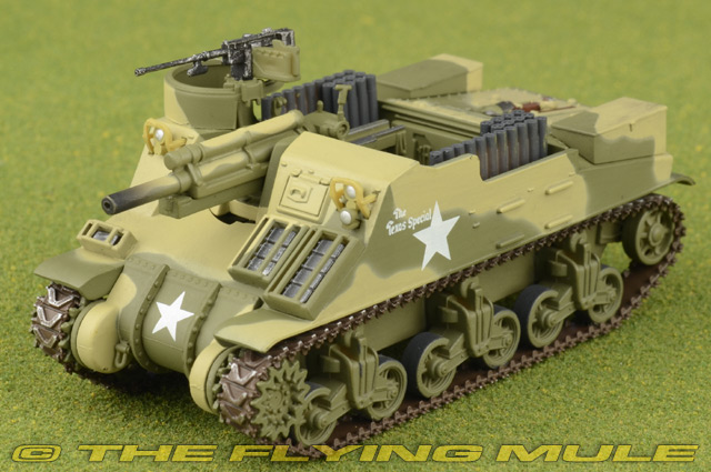 Hobby Master's 1:72 scale M7 Priest is constructed with a blend of diecast metal and plastic to achieve maximum detail. Many fine details can be seen through the open top superstructure, including a simulated diamond plate deck, operator seats and fully-loaded ammo stores. The moveable metal cannon features a detailed breach system, gun sight and dial controls. The vehicle's exterior includes a top-mounted machine gun ring with 50 cal machine gun and separately applied battlefield equipment such as spare track up front and storage boxes and shovel at the rear.
