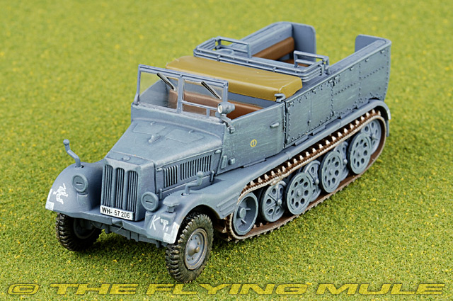 Hobby Master's 1:72 scale Sd.kfz.11 half-track has a plastic body that allows for accurate replication of details, and a diecast metal chassis that provides weight and feel. The body features a crystal clear windshield with separately applied headlamps up front and fine scale rivet details at the rear. With both the front and rear rag-tops in the down configuration, a clear view of the half-track's interior is provided, including a pad-printed instrument panel, a complete set of driver's controls, and simulated front and rear leather covered bench seats. The model's simulated torsion-bar suspension of its six interlaced road wheels is visible on the underside.