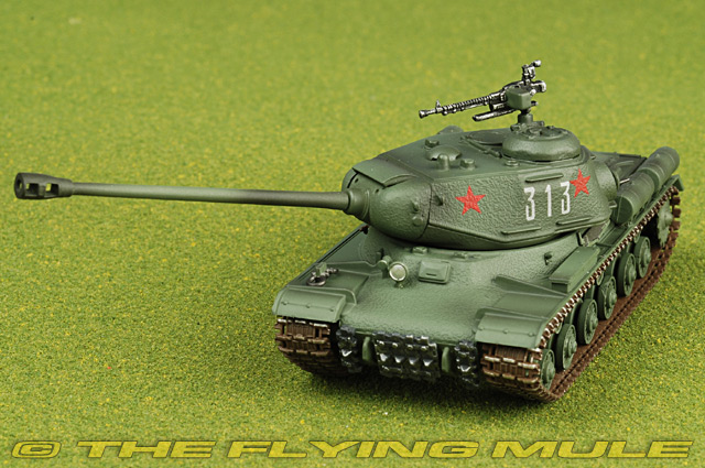 Hobby Master's 1:72 scale JS-2 heavy tank is constructed using an intelligent mix of diecast metal and plastic. The top portion of the hull is made from plastic to replicate fine scale details such as the look and feel of cast metal up front (on the turret as well) and the lower portion from diecast metal to provide weight. The 360 degree rotating turret features an elevating metal gun with an accurate muzzle brake and is fitted with a highly detailed machine gun. Additional details include separately applied battlefield equipment such as a shovel and spare track segments. The twelve road wheels and their associated torsion bar suspension system are also accurately modelled.
