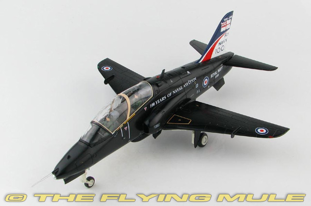 Hawk T.1 Advanced Trainer XX301 was accepted by the RAF February 13, 1980 and assigned to No.1 Tactical Weapons Unit (1TWU) at RAF Brawdy wearing camouflage paint scheme and used for weapons training. In July 1984 the aircraft was converted to a T.1A. In 1992 XX301 was sent to 151 Squadron, 2 TWU at RAF Chivenor. In February 2001 XX301 transferred to FRADU (Fleet Requirements and Air Direction Unit). In 2009 XX301 had markings celebrating 100 Years of Naval Aviation. In June 2015 transferred to 736 NAS, RNAS Culdrose. Designed to meet an RAF requirement for a fast trainer to replace the Folland Gnat, the BaE Hawk first flew on August 21, 1974. This tandem two-seat aircraft has a distinctive appearance, with the front seat positioned below the rear seat so that the instructor has a clear view of the student's cockpit. The Hawk is subsonic in level flight but can achieve Mach 1.15 in a dive, giving trainees the experience of supersonic flight. Hawks are expensive to produce but durable and maneuverable enough to be used for combat. The Hawk is in use in 18 different nations, and is still in production today. © Copyright 2003-2025 The Flying Mule, Inc. The Hobby Master "1:48 Air Power Series" range presents detailed, ready-made diecast models of military aircraft. Hobby Master "1:48 Air Power Series" diecast airplanes feature: - Diecast metal construction with some plastic components.