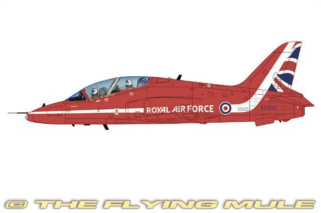 At the Royal International Air Tattoo 2025, the Red Arrows dazzled crowds at RAF Fairford with their signature precision aerobatics, marking another highlight in their storied history. Their display included tight formation maneuvers, dynamic rolls, and synchronized passes, demonstrating both skill and teamwork. This year, the team incorporated sustainable aviation fuel, reflecting the RAF's commitment to reducing carbon emissions. A special flypast alongside the RAF's new E-7 Wedgetail AEW.1 showcased integration between aerobatic excellence and advanced surveillance capabilities. Spectators also enjoyed the Red Arrows' vibrant red, white, and blue smoke trails, reinforcing their iconic status and inspiring both aviation enthusiasts and the wider public alike. Designed to meet an RAF requirement for a fast trainer to replace the Folland Gnat, the BaE Hawk first flew on August 21, 1974. This tandem two-seat aircraft has a distinctive appearance, with the front seat positioned below the rear seat so that the instructor has a clear view of the student's cockpit. The Hawk is subsonic in level flight but can achieve Mach 1.15 in a dive, giving trainees the experience of supersonic flight. Hawks are expensive to produce but durable and maneuverable enough to be used for combat. The Hawk is in use in 18 different nations, and is still in production today. © Copyright 2003-2025 The Flying Mule, Inc. The Hobby Master "1:48 Air Power Series" range presents detailed, ready-made diecast models of military aircraft. Hobby Master "1:48 Air Power Series" diecast airplanes feature: - Diecast metal construction with some plastic components.