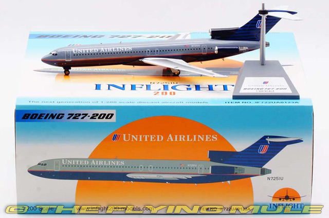 | Boeing 727-200 | | 9.25" | | 6.5" | Designed as a smaller, short/medium-ranged complement to the 707, the 727 was first flown on February 9th, 1963. © Copyright 2003-2025 The Flying Mule, Inc. The Inflight 200 range presents detailed, ready-made diecast models of civilian and military transport aircraft. Inflight 200 diecast airplanes feature: - Diecast metal construction with some plastic components.