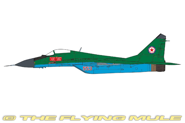 JC's 1:72 scale MiG-29 is constructed almost entirely of diecast metal, with careful attention paid to even the smallest of details. This is a model with many movable parts, including a hinged canopy, deployable speed breaks and movable rudders with correctly replicated actuator mechanism. The landing gear is highly detailed, with rivets inside the gear doors, separately applied transparent landing lights, structural detail inside the wheel wells and a detailed splash fender. The auxiliary air inlet's louvers seamlessly blend with the upper fuselage. Fully armed with a 30mm cannon and three different missile types, this model is available as the single-seat A variant or two-seat B variant.