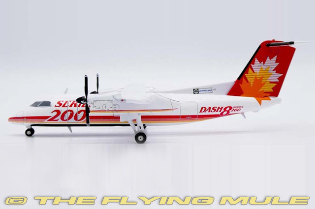 | Bombardier Dash 8-200 | | 4.5" | | 5" | Designed as a short-haul transport based on the Dash 7 design, the Bombardier Dash 8 (formerly de Havilland Canada DHC-8) was first flown on June 20th, 1983. Appearing to be a smaller, twin-engined version of the Dash 7, the Dash 8 design placed less emphasis on STOL (Short take-off and landing) capability and focused more heavily on economical operation. The two Pratt & Whitney PW100 engines mated to a very high aspect ratio wing enabled the Dash 8 to offer the lowest cost per passenger mile of any regional airliner of it's era. © Copyright 2003-2025 The Flying Mule, Inc. The JC Wings "1:200" range presents higly-detailed, ready-made diecast models of civilian aircraft in 1:200 scale. JC Wings diecast airplanes feature: - Diecast metal construction, including wings and tail surfaces.