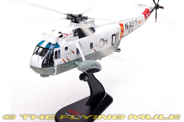 The SH-3G Sea King operated with Helicopter Combat Support Squadron 2, HC-2, aboard USS John F Kennedy during Atlantic Fleet deployments in the 1970s. HC-2 detachments used the SH-3G for plane guard duty, search and rescue, vertical replenishment, and general utility support for the carrier air wing. The G model was optimized for logistics and rescue rather than anti submarine warfare, featuring simplified mission equipment and increased cabin utility. Operating from USS Kennedy, SH-3G crews maintained constant alert during flight operations, providing critical aircrew recovery and support services throughout Cold War era carrier deployments. Designed to meet a US Navy requirement for an all-weather amphibious helicopter, the Sikorsky SH-3 Sea King first flew on March 11, 1959. Originally a submarine hunter-killer, the Sea King has since been used in a variety of operations, from search and rescue, executive transport and communications to anti-ship and airborne early warning. Its five main rotor blades and tail section fold for stowage aboard aircraft carriers, and its hull can remain temporarily watertight for water landings-a risky maneuver attempted only in emergencies. When deployed by aircraft carriers, Sea Kings serve as plane guard and are the first in the air and the last to return. © Copyright 2003-2026 The Flying Mule, Inc. The Legion Models 1:72 Aircraft range presents detailed, ready-made diecast models of military aicraft in 1:72 scale. Legion Models diecast airplanes feature: - Diecast metal construction with some plastic components.