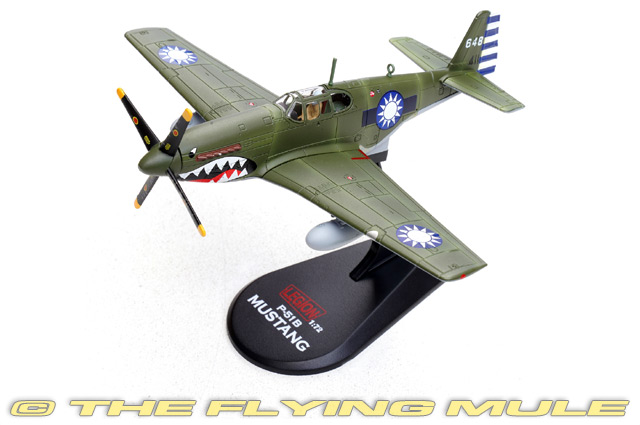 Early in 1945 P-51Cs, Ds and Ks began to arrive in the Pacific Theater of Operation since they were no longer needed in large numbers in Europe. The first units to receive the Mustangs were the 8th and 32nd Pursuit Squadrons of the 3rd Pursuit Group. These aircraft were also assigned to the 3rd, 4th and 5th Fighter Groups and eventually equipped seven Chinese Air Force Air Groups. Between January and June 1945 and with over eight hundred aircraft between the two forces they carried out attacks against Japanese forces in occupied China. Designed to meet an RAF requirement for fighter-bomber and reconnaissance aircraft, the P-51 Mustang was first flown on October 26th, 1940. This versatile aircraft was capable of escorting bombers on long-range missions, engaging in dogfights, and dropping down to destroy German targets on the ground. At least eight versions of the P-51 were produced, but it was the definitive P-51D that gave the Mustang its classic warbird appearance. Britain and the US both tested the airframe with the Rolls-Royce Merlin engine, which gave the aircraft tremendous performance gains. The Truman Senate War Investigating Committee called the Mustang "the most aerodynamically perfect pursuit plane in existence." © Copyright 2003-2025 The Flying Mule, Inc. The Legion Models range presents detailed, ready-made diecast models of military aicraft in 1:72 scale. Legion Models diecast airplanes feature: - Diecast metal construction with some plastic components.