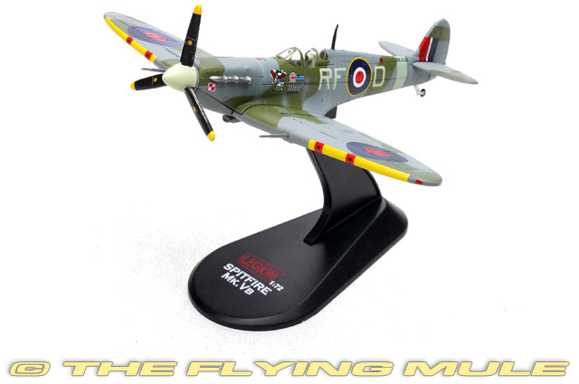 The 303 "Kosciuszko" Squadron was a Polish-manned Fighter Squadron and part of the RAF. During the Battle of Britain the 303 Squadron recorded more victories than any of the other 66 allied fighter squadrons. The 303 Squadron Leader was Jan Zumbach who scored eight victories during the BoB. EN951 was the last of three different Spitfires Zumbach had flown. The victory markings on his aircraft were German crosses outlined in white for confirmed victories and red for probables. Zumbach ended the war with 13 1/3 victories. Designed by R.J.Michell to meet a British Air Ministry specification, the Supermarine Spitfire first flown on March 5th, 1936. With its combination of beautiful fighter design, the excellent performance of its Rolls-Royce Merlin powerplant and firepower provided by twin cannons and four machine guns, the Spitfire became an unrivaled symbol of victory. The Spitfire had 40 major variants and was built in greater numbers than any other British aircraft of the time. It flew operationally on every front between 1939 and 1945 and was engaged in every one of the Royal Air Force's major actions. © Copyright 2003-2025 The Flying Mule, Inc. The Legion Models range presents detailed, ready-made diecast models of military aicraft in 1:72 scale. Legion Models diecast airplanes feature: - Diecast metal construction with some plastic components.