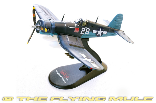 Lieutenant Ira "Ike" Kepford was one of the most famous U.S. Navy Corsair aces of World War II, flying with VF-17, the "Jolly Rogers." Assigned to the F4U-1A Corsair, Kepford quickly distinguished himself in combat over the Solomon Islands in late 1943 and early 1944. Known for his aggressive flying style and precision marksmanship, he achieved 16 confirmed aerial victories, making him the Navy's top Corsair ace. His aircraft, marked "29," carried the distinctive Jolly Rogers skull-and-crossbones insignia that became legendary. Kepford's exploits not only boosted VF-17's reputation but also solidified the Corsair's fearsome combat record in the Pacific. Designed to meet a US Navy requirement for a single-seat carrier based fighter, the F4U was first flown on May 29th, 1940. This versatile aircraft saw service with both the Navy and Marine Corps in WW II and in the Korean War. During its lifetime, the Corsair underwent numerous improvements such as a lengthened fuselage, a high visibility bubble-top canopy and folding inverted gull wings that provided clearance for a large propeller. Its performance advantage, 400 mph capability, the ability to withstand punishment and six .50 Browning machine guns made the F4U a devastating weapon against aircraft, ground targets and ships. © Copyright 2003-2025 The Flying Mule, Inc. The Legion Models range presents detailed, ready-made diecast models of military aicraft in 1:72 scale. Legion Models diecast airplanes feature: - Diecast metal construction with some plastic components.